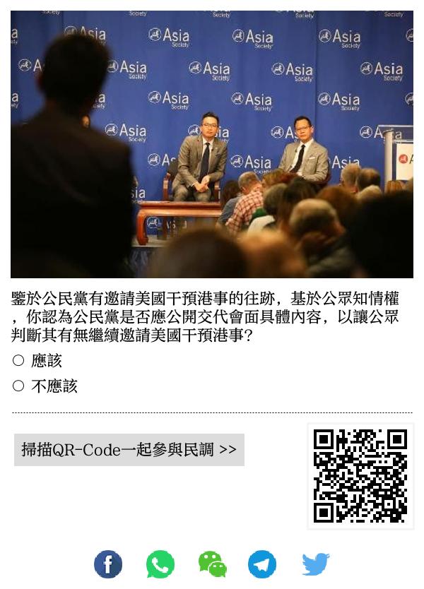 鑒於公民黨有邀請(qǐng)美國(guó)干預(yù)港事的往跡,基於公眾知情權(quán),你認(rèn)為公民黨是否應(yīng)公開(kāi)交代會(huì)面具體內(nèi)容,以讓公眾判斷其有無(wú)繼續(xù)邀請(qǐng)美國(guó)干預(yù)港事?